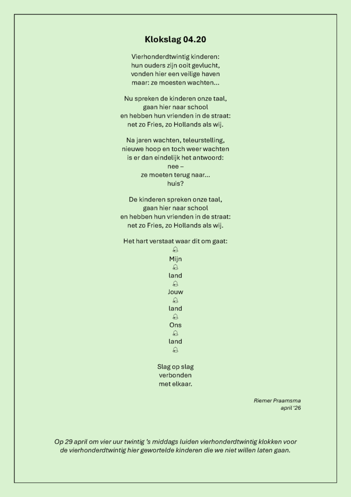 Al meer dan 16 maanden luidt Open Hof in Kampen symbolisch de klok voor kinderen. Speciaal voor Aram, Ariana, Amelia en Alexa Babayants en alle 420 gewortelde kinderen. Meer dan 2000 mensen stonden op. Maar in Den Haag blijft het stil. Dat is precies het lot van kinderstemmen. Te zacht om gehoord te worden. De kerk in Kampen versterkt hun stem. Wat zou het mooi zijn als vierhonderdtwintig kerken in Nederland deze stem willen versterken door de klok te luiden voor gewortelde kinderen. Om deze reden heeft de kerkenraad besloten ook mee te doen.