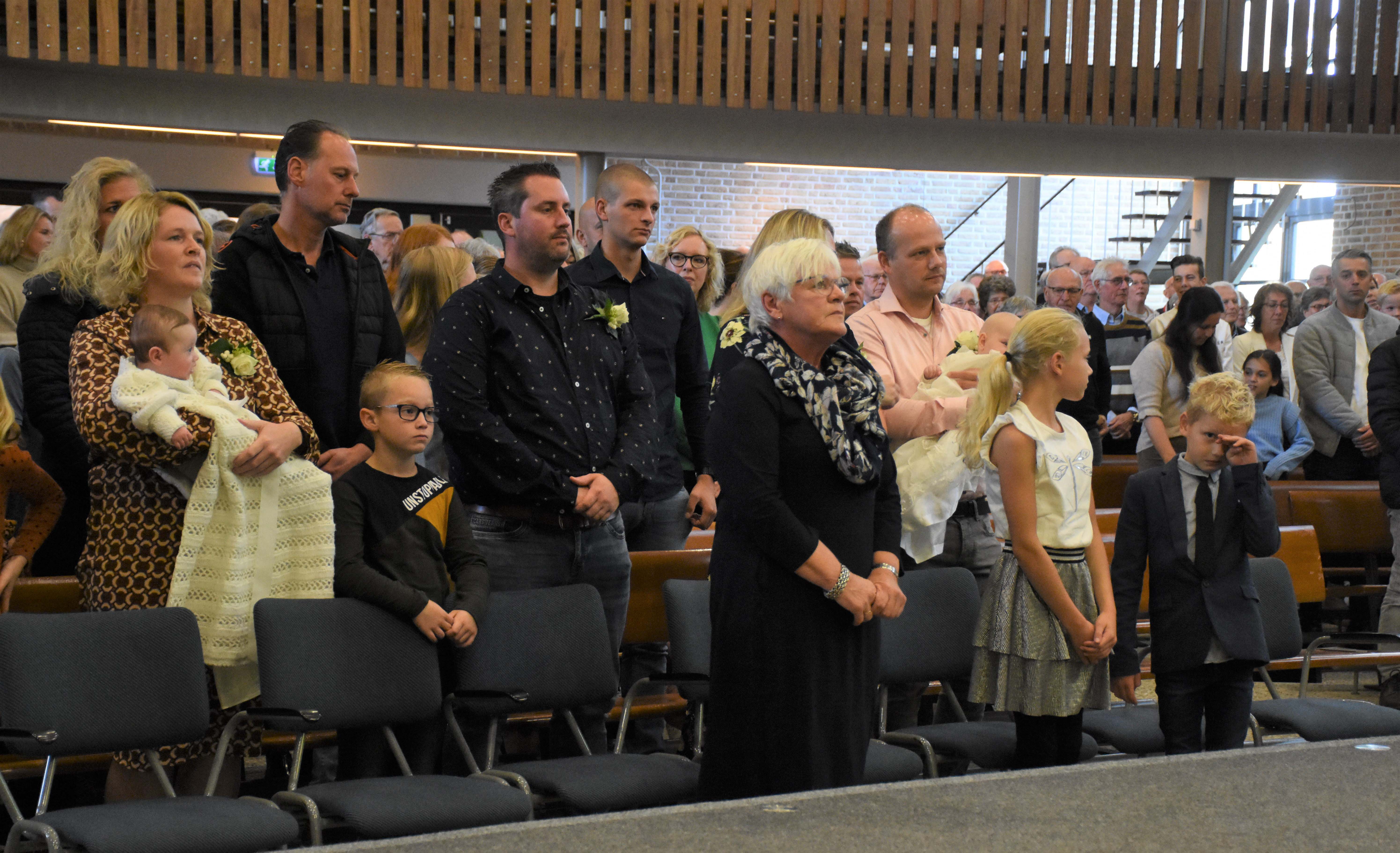 Aan de gemeente werd gevraagd: Wilt U deze kinderen en hun gezinnen dragen in uw gebeden, opnemen in uw midden en naar uw vermogen te helpen groeien in geloof, in gelovig voorgaan in het volgen van Jezus Christus? Door de gemeente volmondig beantwoord met ‘Ja, van harte’. Staande werden de doopouders en hun kinderen lied 416 toegezongen ‘Ga met God en Hij zal met je zijn’.