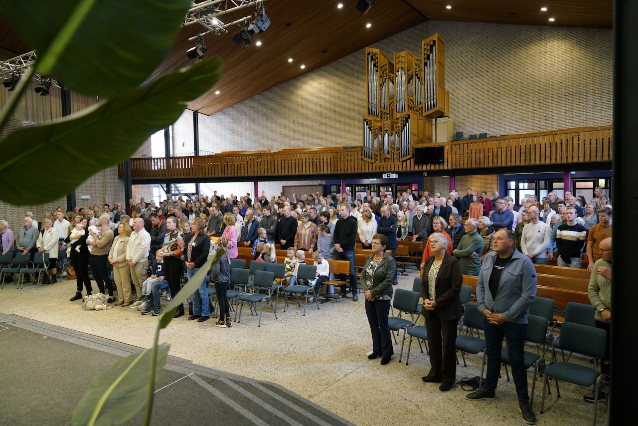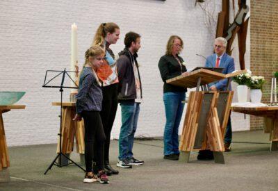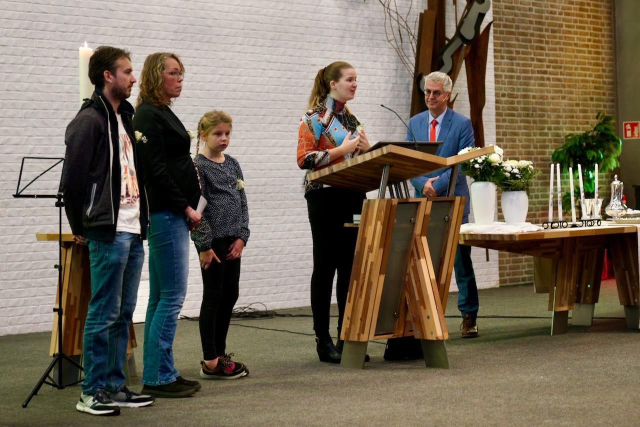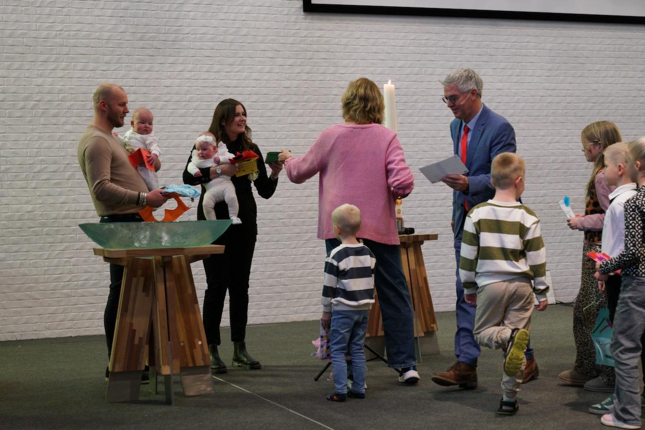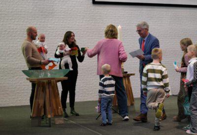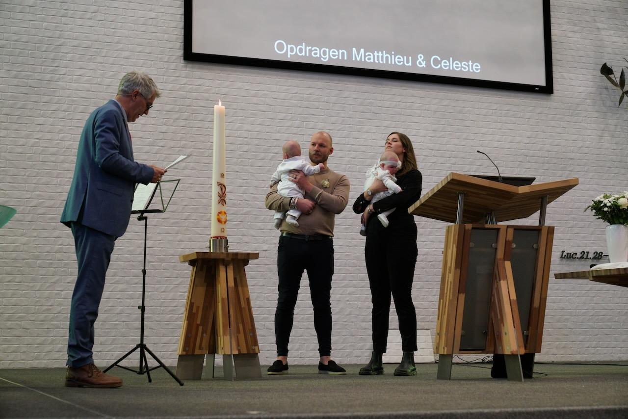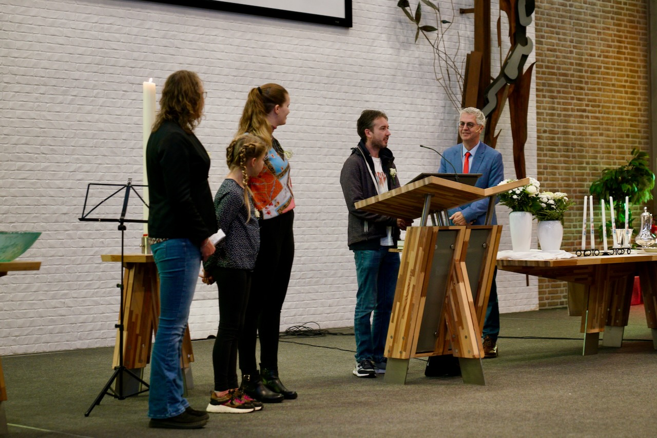 “Ook voor ons is het een bijzondere dag”, liet ds. Hans de Jong aan het begin van de dienst weten. Getuigenissen werden afgelegd door Mark Schraag, Naomi Trijntje Oegema, Deborah Anne Hoekstra, Elizabeth van Houten en Jan en Maryse Amber Stienstra. Aansluitend werd de tweeling Matthieu Henri Peter en Celeste Isabel Gea Stienstra opgedragen. De schriftlezing voor deze dienst was gekozen uit Romeinen 6 waarin onder meer wordt ingegaan op de betekenis van de doop. “De doop laat zien dat we bij Jezus horen. Door onze doop zijn we eigenlijk samen met hem gestorven en begraven. En door onze doop leven wij als nieuwe mensen. Want Christus leeft! Onze machtige Vader heeft hem laten opstaan uit de dood.” Met verwijzing naar de brief van Paulus aan de Romeinen ging ds. De Jong daar verder op in.