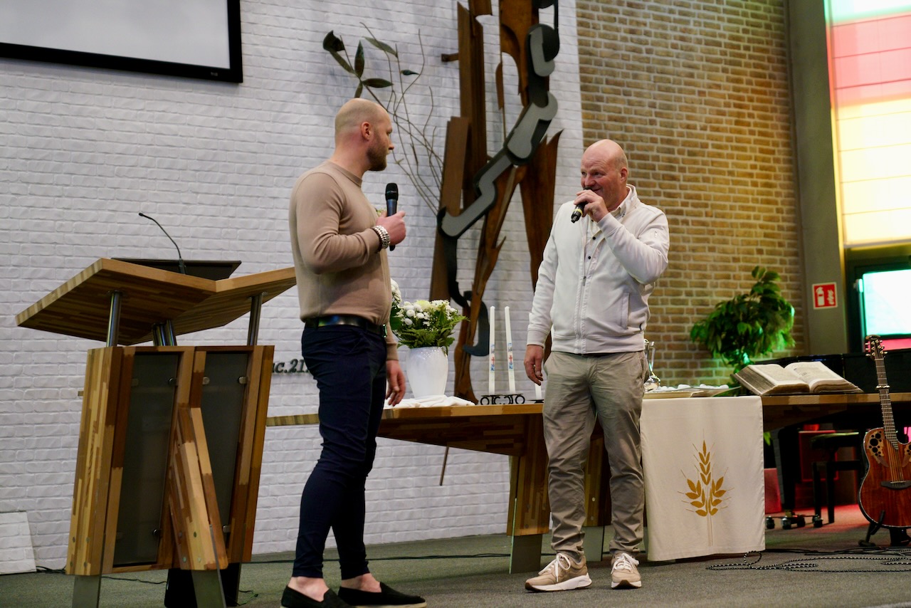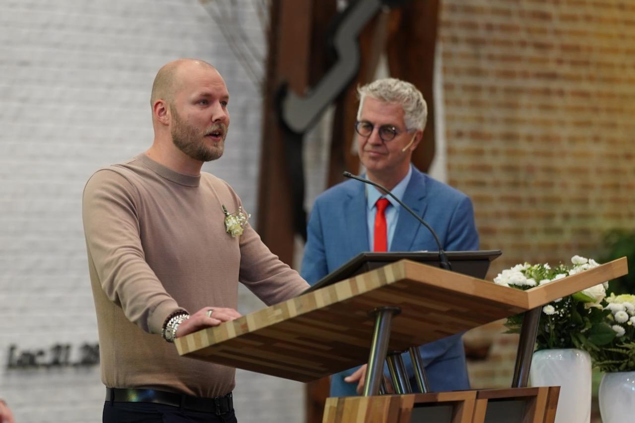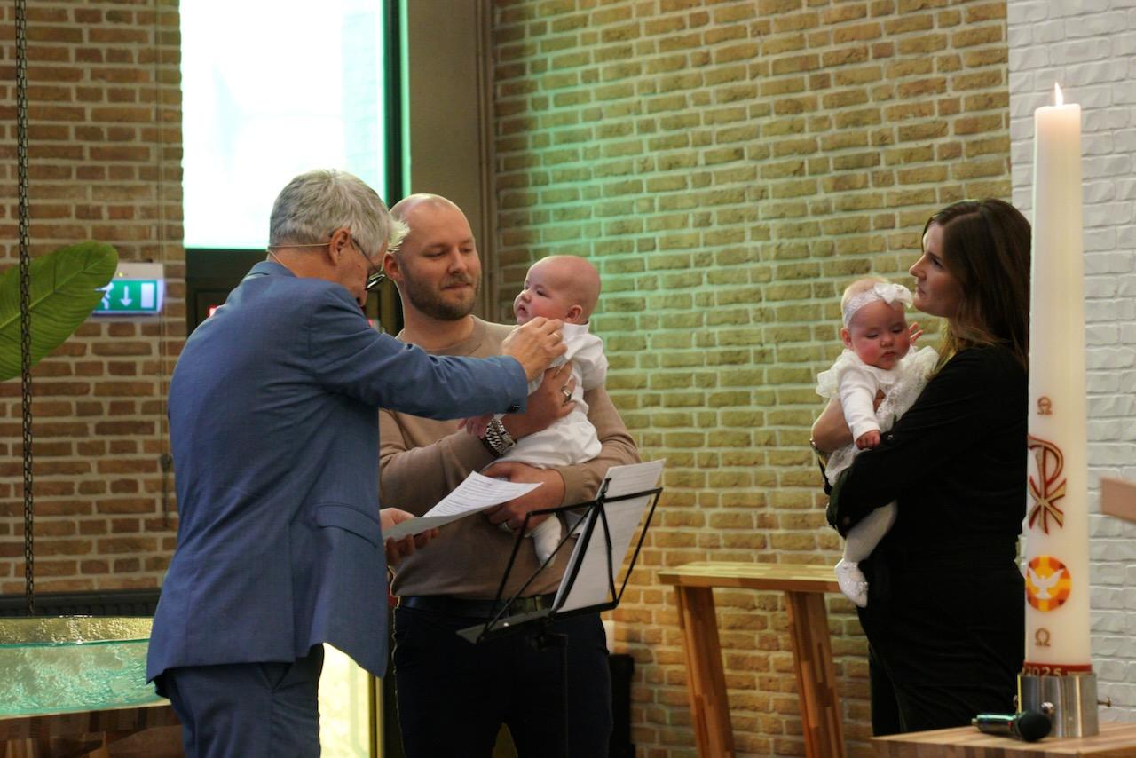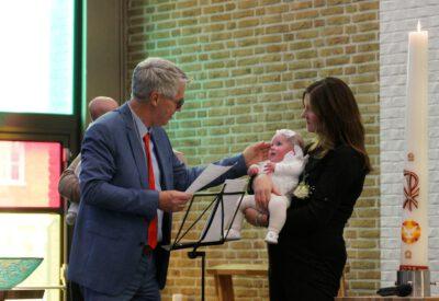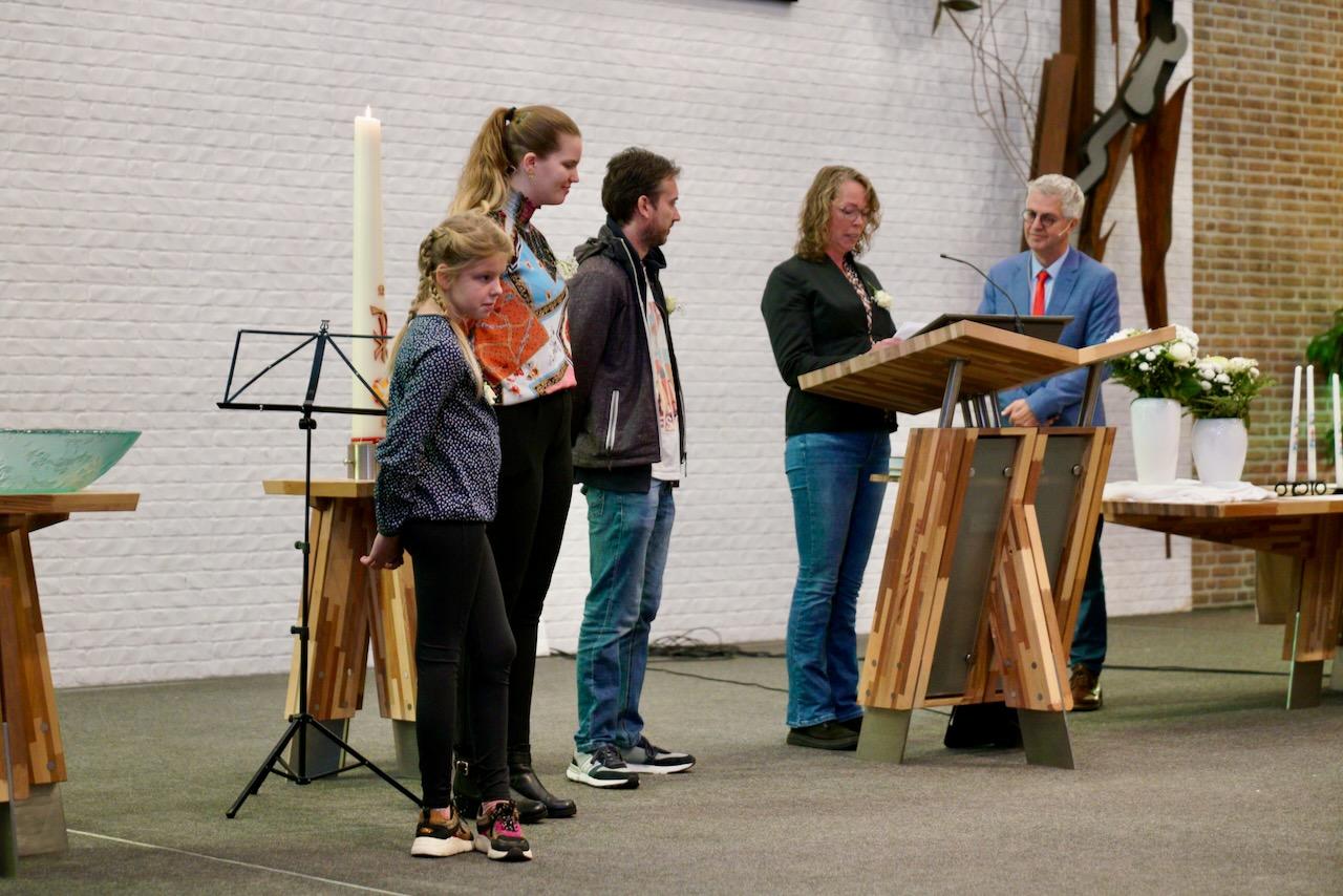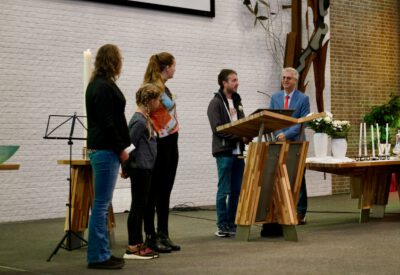 “Ook voor ons is het een bijzondere dag”, liet ds. Hans de Jong aan het begin van de dienst weten. Getuigenissen werden afgelegd door Mark Schraag, Naomi Trijntje Oegema, Deborah Anne Hoekstra, Elizabeth van Houten en Jan en Maryse Amber Stienstra. Aansluitend werd de tweeling Matthieu Henri Peter en Celeste Isabel Gea Stienstra opgedragen. De schriftlezing voor deze dienst was gekozen uit Romeinen 6 waarin onder meer wordt ingegaan op de betekenis van de doop. “De doop laat zien dat we bij Jezus horen. Door onze doop zijn we eigenlijk samen met hem gestorven en begraven. En door onze doop leven wij als nieuwe mensen. Want Christus leeft! Onze machtige Vader heeft hem laten opstaan uit de dood.” Met verwijzing naar de brief van Paulus aan de Romeinen ging ds. De Jong daar verder op in.