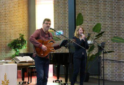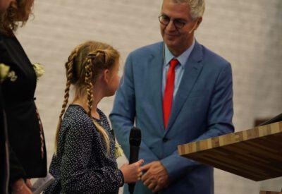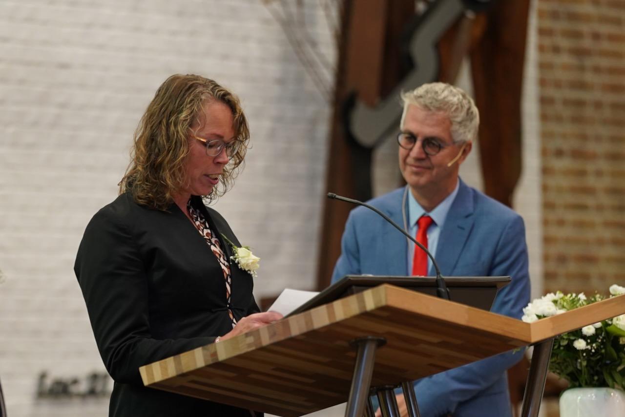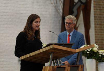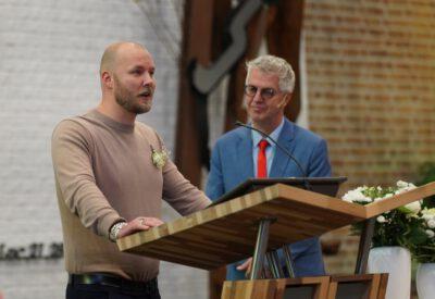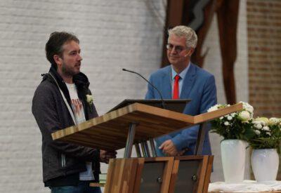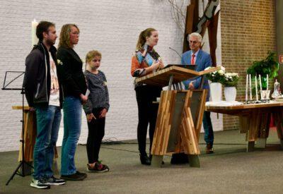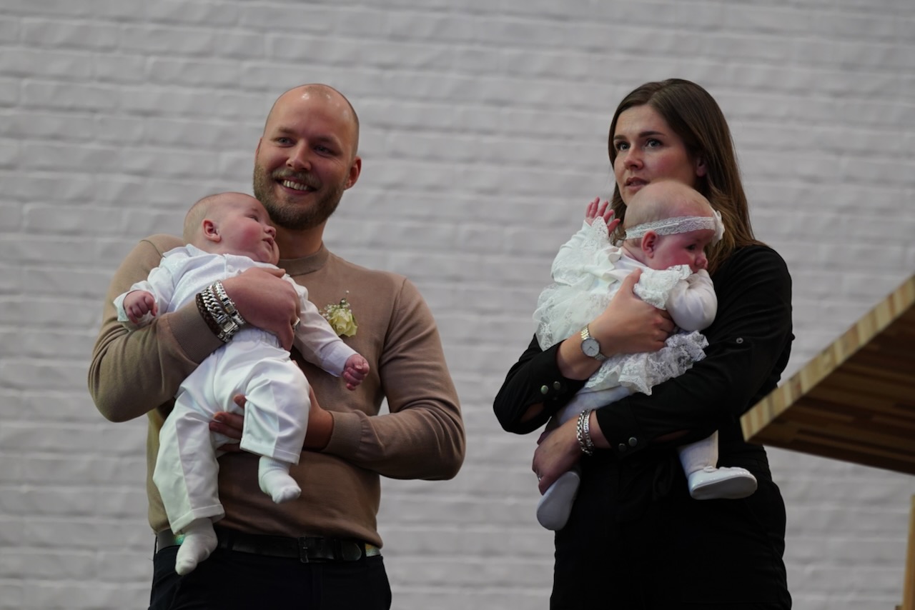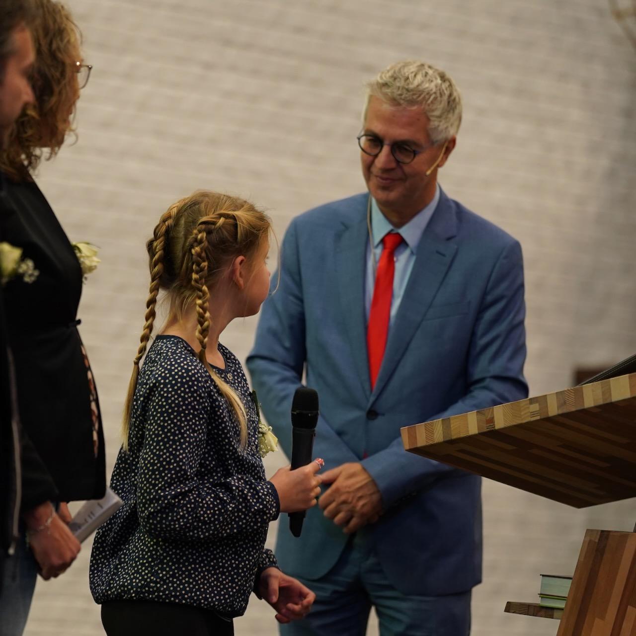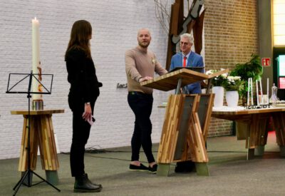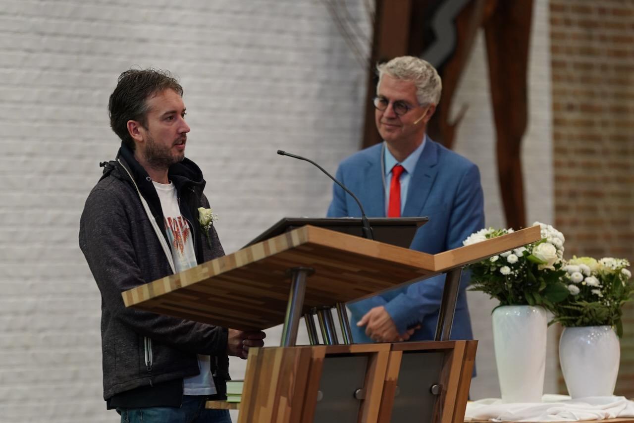 “Ook voor ons is het een bijzondere dag”, liet ds. Hans de Jong aan het begin van de dienst weten. Getuigenissen werden afgelegd door Mark Schraag, Naomi Trijntje Oegema, Deborah Anne Hoekstra, Elizabeth van Houten en Jan en Maryse Amber Stienstra. Aansluitend werd de tweeling Matthieu Henri Peter en Celeste Isabel Gea Stienstra opgedragen. De schriftlezing voor deze dienst was gekozen uit Romeinen 6 waarin onder meer wordt ingegaan op de betekenis van de doop. “De doop laat zien dat we bij Jezus horen. Door onze doop zijn we eigenlijk samen met hem gestorven en begraven. En door onze doop leven wij als nieuwe mensen. Want Christus leeft! Onze machtige Vader heeft hem laten opstaan uit de dood.” Met verwijzing naar de brief van Paulus aan de Romeinen ging ds. De Jong daar verder op in.