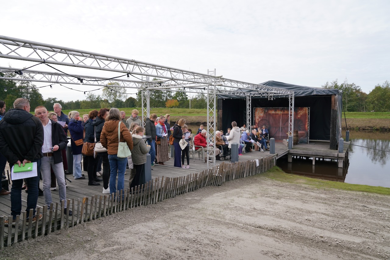 Op het erf van Henk en Gea Stienstra werd een ieder warm ontvangen met een kop koffie of thee en een lekker broodje en er was voor iedereen een gedrukte liturgie. Het was fris, maar prachtig weer. “Fris, maar met een warme sfeer waarmee het samen gemeente zijn nadrukkelijk tot uiting kwam”, aldus één van de aanwezigen. Er werd gezongen, gebeden en … gedoopt! Hans de Jong en Anne-Willem Hoekstra stonden als voorgangers tot aan hun middel in het water en riepen de dopelingen één voor één, om zich in het water te begeven waarna de doop en de doopbevestiging door onderdompeling plaats kon vinden.