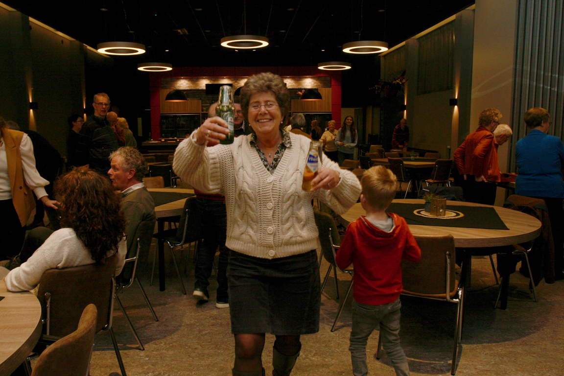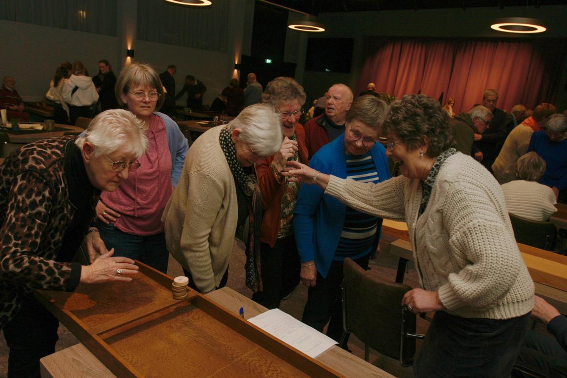 Twee oudere dames moffelen snel een sjoelblokje weg als de fotograaf in de buurt komt. “Der is ien tefolle”, fluisteren ze. “Dat hiene se krekt hjirneist ek.” Af en toe vliegt er een sjoelblokje door de zaal en er zal dan ook een stand niet helemaal correct zijn. “It is ien en al gesellichheid”, zo stelt het verbindingsteam vast. “Alwer in slagge jûn.” Overal is het gezellig, als je niet aan het spelen bent, dan zit je wel even gezellig ergens te kletsen.