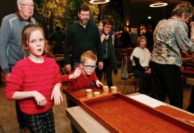 Het is vrijdagmiddag 10 maart, even na zes uur. De dames van het Connexion verbindingsteam dienen het hoofdgerecht op in de Vleckeseal van De Lantearne. Maar liefst tachtig personen zijn er afgekomen op Soep & Sjoelen, een prima passende combinatie van samen eten en vervolgens het spelen van het Hollandse gezelschapsspel. In no-time zijn alle gasten voorzien van groenten- of tomatensoep en even later hebben ze er een broodje met kroket, kaas of ham bij. Ondertussen legt spelleider Derick Hiemstra uit hoe de teams worden verdeeld over de zestien banen waarop ze telkens wisselend van baan vijf wedstrijden spelen. “Take it away”, nodigt hij de spelers tot spel.