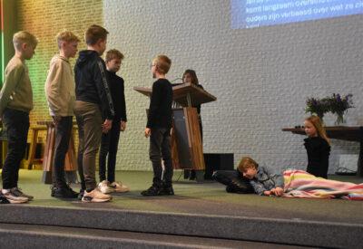 Groep 4 begeleidde het ‘Who is the King of the jungle’ met gebaren, waarna groep 6b en 7a met het toneelstukje ‘Het dochtertje van Jaïrus’ het Bijbelgedeelte uit Marcus vertelden. Groep 1 en 2 het verhaal van de vijf broden en twee vissen uitbeeldden, afgesloten met het zingen van het lied ‘Vijf broden en twee vissen’ van Elly & Rikkert. Groep 3 bracht ‘Jezus zegent de kinderen’, met als afsluiting het lied ‘Laat de kinderen tot mij komen’.