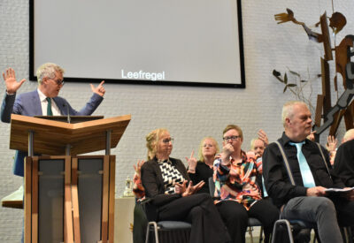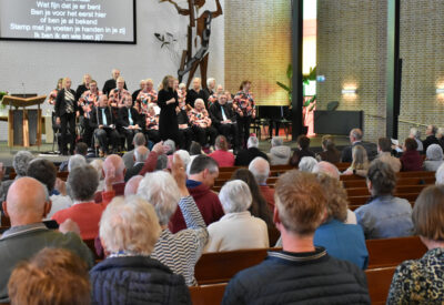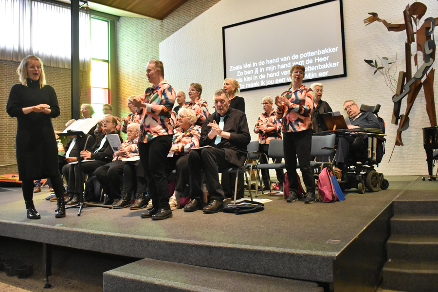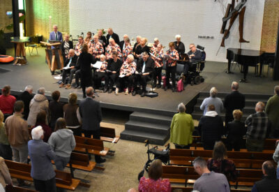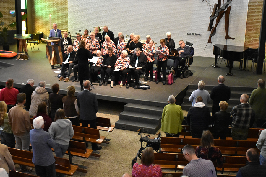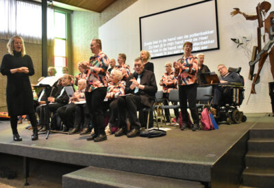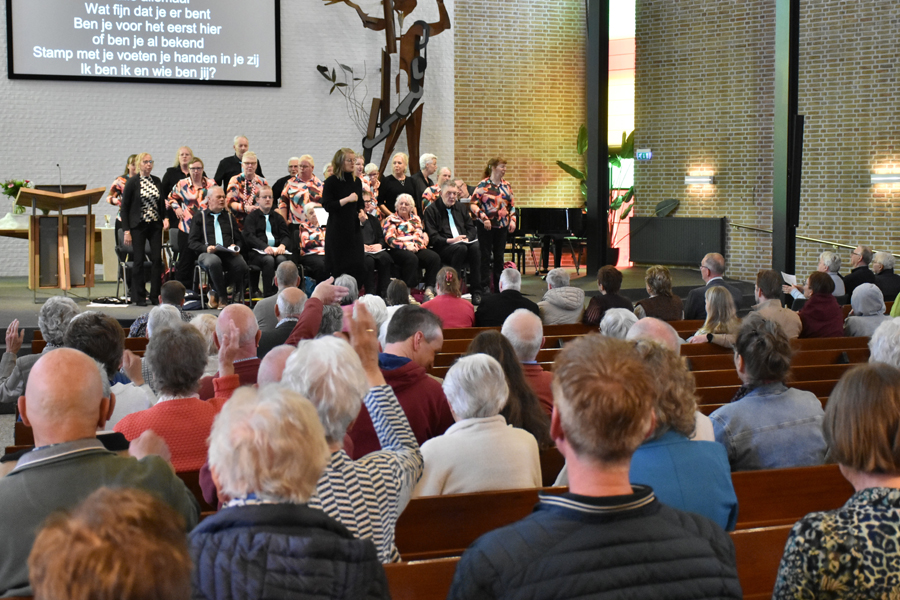 Wat een vrolijk onthaal aan het begin van de dienst met medewerking van zangkoor “De kleine kracht” uit Dokkum onder leiding van Chantal Brunt, want we zingen en zwaaien met het lied van de bekende televisieserie De luizenmoeder; “Hallo allemaal, wat fijn dat je er bent.”