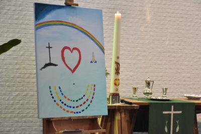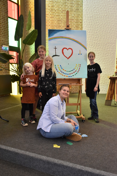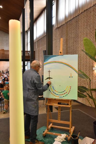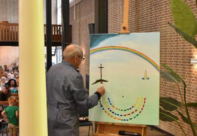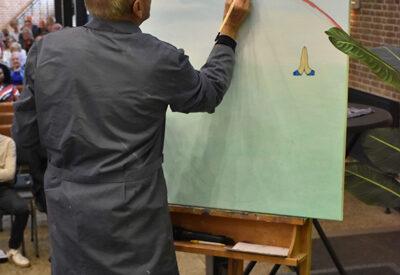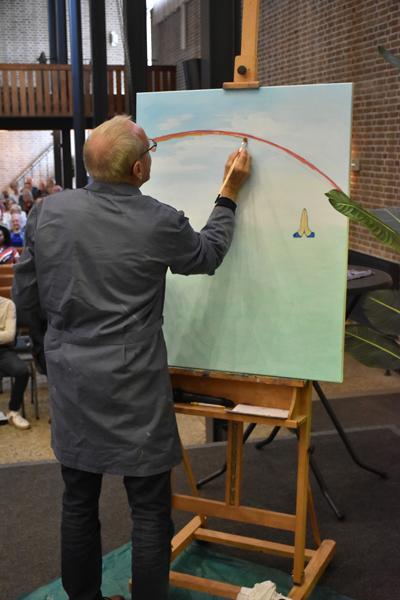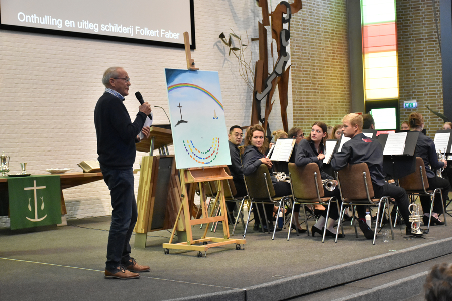 De voorbereidingscommissie had Folkert Faber gevraagd om een schilderij te maken over het jaarthema. Dat deed hij tijdens de dienst om aan het eind daarvan tekst en uitleg te geven wat hij aan het doek had toevertrouwd. Een opdracht – niet gemakkelijk – waarvan hij niet wist hoe het aan te pakken. Folkert: “Ik heb er om gebeden. En dit is het geworden. Ik zag eerst naar de drieenige God. De regenboog, dat is God. Een boog in de wolken, als teken van trouw. Het kruis, dat is Jezus, onze Redder. We denken aan Goede Vrijdag, aan Pasen. Wat Hij voor ons gedaan heeft.”