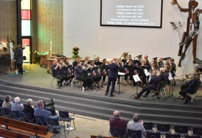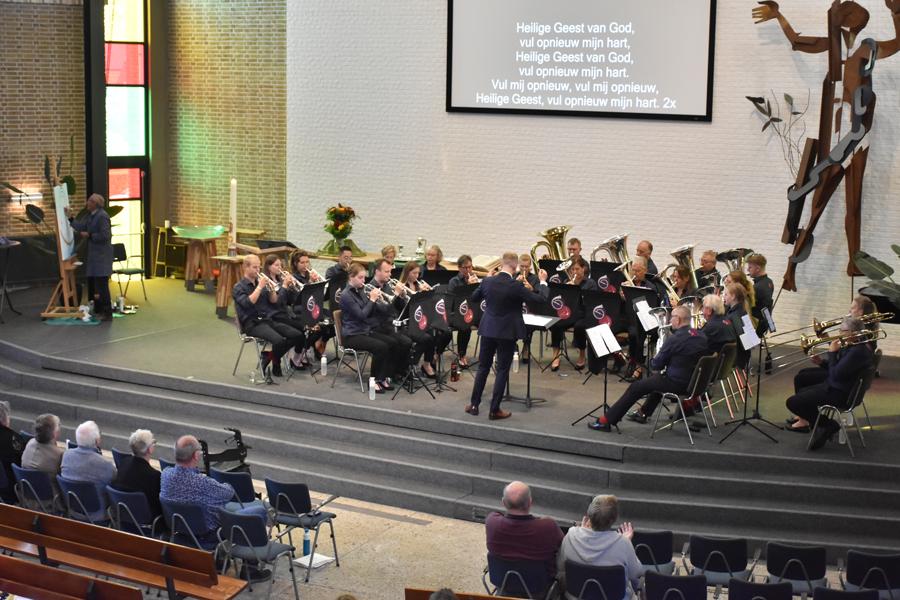 Folkert draait het schilderij om. “Dan de Heilige Geest. Wat je hier ziet, dat is hier en ook daar.” Hij doelt daarbij op de aanwezigen in de kerkzaal maar ook weergegeven op het doek. Hij verwijst daarbij naar de brassband. “Dat zijn allemaal verschillende mensen. Vandaag mogen zij voor ons een voorbeeld zijn. Het zijn mannen en vrouwen, verschillende leeftijden, ze denken verschillend en ze bespelen allemaal een ander instrument. Een chaos toch? Ze hebben wél een dirigent. En die brengt er lijn in. Jullie zijn gefocust op hem en jullie muziekstuk. Dat is heel belangrijk. Jullie gunnen elkaar om een eenheid te worden als jullie samen spelen. Allemaal gericht op de dirigent.”