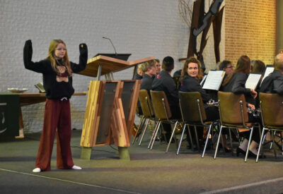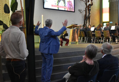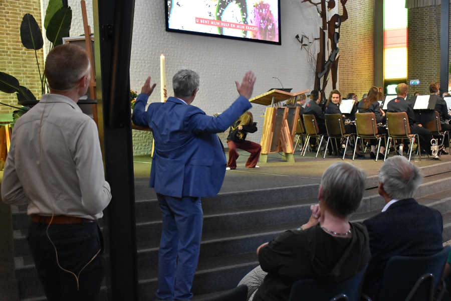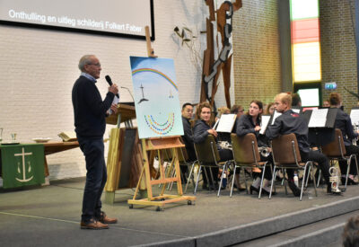 Folkert draait het schilderij weer in zijn eerste stand. “Nu zijn wij de gemeente”, zo vervolgt hij zijn uitleg. “Wij zijn allemaal verschillend, wij denken verschillend. Omdat wij allemaal verschillend zijn hebben wij een dirigent nodig. God is onze dirigent. Hij wil ons leiden. Wij mogen voor elkaar bidden door Zijn Heilige Geest. We mogen bidden voor ons persoonlijk, voor anderen. Wij hebben het de afgelopen tijd zelf ervaren. Zoveel mensen hebben voor ons gebeden om kracht. En die hebben we gekregen ook. We mogen bidden voor onze gemeente, voor eenheid in onze gemeente omdat we zo verschillend zijn. Wij mogen net zoals ons muziekkorps één zijn, één worden. En dat kunnen wij alleen onder leiding van Zijn Geest. Als we voor elkaar bidden, dan kunnen wij als onze gemeente een prachtige toekomst tegemoet gaan.”