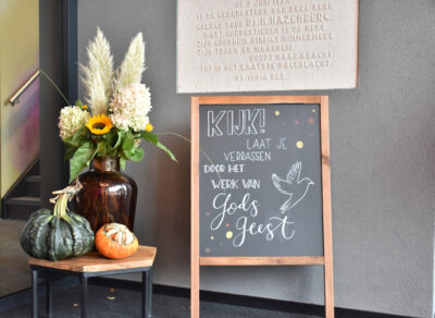 Bij binnenkomst ontving iedere bezoeker twee kaartjes met de tekst ‘IK ZAL JULLIE EEN HELPER GEVEN, DE HEILIG GEEST. HIJ ZAL ALTIJD BIJ JULLIE ZIJN” (Johannes 14:16). Eén kaartje om zelf te houden en een geadresseerd kaartje om weg te geven/sturen met een warme groet en zegen van onze gemeente.