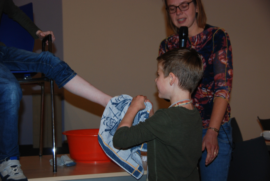 In de bijbel liepen de mensen op sandalen en was het stoffig en vuil. Ze zaten niet aan tafel, maar lagen aan tafel. Dus je wilde natuurlijk niet naast vieze voeten liggen. Normaal was er een slaaf die de voeten waste, maar deze keer hadden de leerlingen van Jezus dat blijkbaar niet geregeld. Niemand van hen stond op om dit vieze karweitje te doen. Jezus stond op en waste de voeten van zijn leerlingen. Misschien ontlopen wij ook wel eens de afwas of een ander klusje. Of vinden we het niet zo gemakkelijk om de minste te zijn. Ook deze dag waren er geweldige knutsels en spellen. Aansluitend werd er heerlijk aan tafel pannenkoeken gegeten!