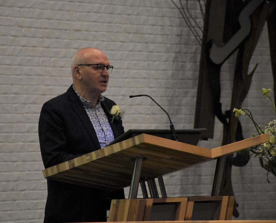 Het thema van de verkondiging was ‘Alleen Samen’. Hans de Jong: “Het is ook een woord voor de kerk, voor de kerk van Jezus Christus. Voor mensen die het willen wagen met God de Vader, met zijn Zoon en vol van de Geest de weg van geloven, hopen en liefhebben willen gaan. Als je het hebt over stokpaardjes, dat is het stokpaardje van mij: geloven, hopen en liefhebben.” Werkwoorden dus. “Heb ik dat zelf bedacht? Nee. Als je een beetje thuis bent in de bijbel: het zijn woorden van Paulus, maar dan net anders. Hij heeft het over Geloof, hoop en liefde, zelfstandige naamwoorden.”