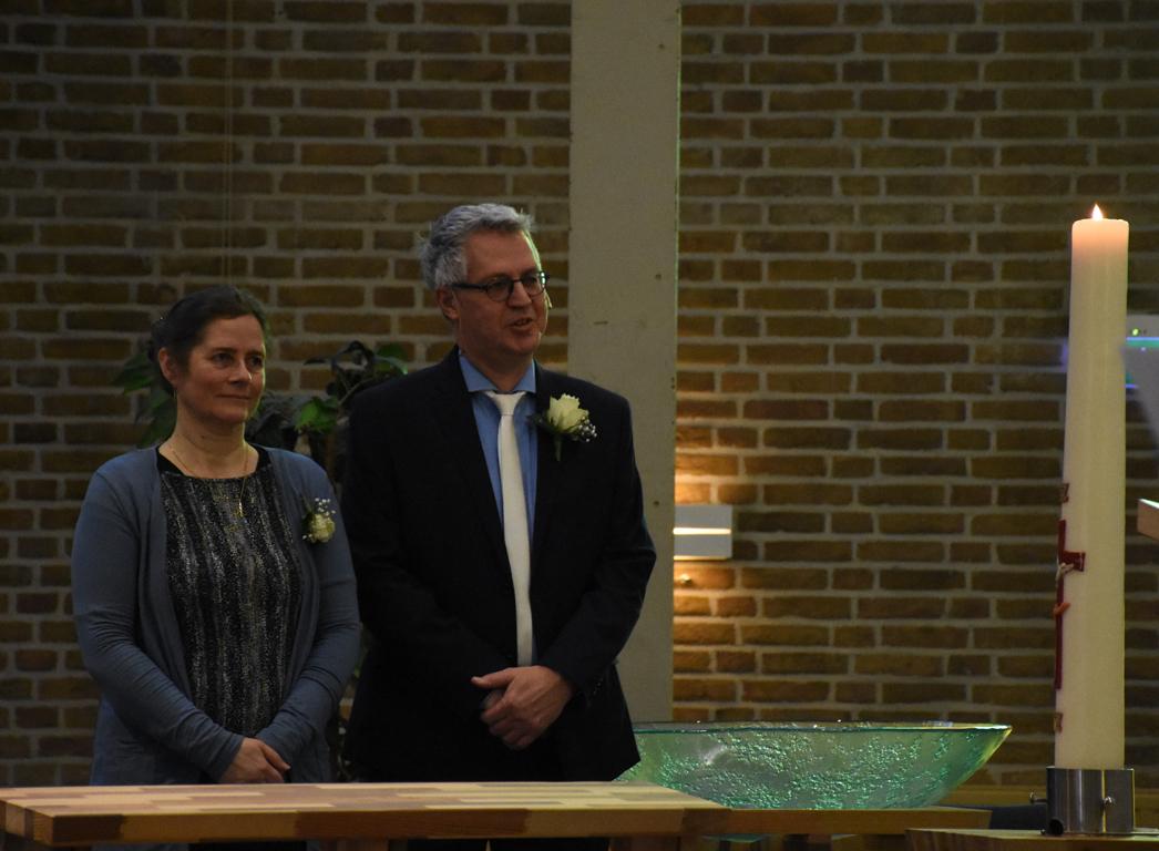 Hans en Feikje de Jong werden namens de gemeente toegesproken door Joop Atsma, voorzitter van het College van kerkrentmeesters. “De gemeente ervaart het als een zegening dat jullie hier zijn, dat jij onze nieuwe predikant wilt zijn. Ik herinner mij nog goed dat die avond dat er een beroep op jou werd uitgebracht en de kerk veel voller was dan nu, dat er toch één helder antwoord kwam en dat was een klaterend applaus. Dat vonden we met z’n allen heel indrukwekkend. Dat betekent dat jullie meer dan van harte welkom zijn.”